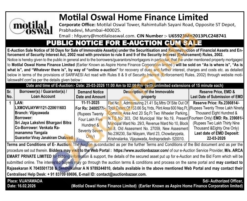 Flat No.1, Admeasuring 21.41 Sq.Mtrs Of Site Out Of Total Extent Of 153.66 Sq. Yrds, Plint Area 600 Nsq. Ft, Common Area And 20 Sq.Ft Two Wheeler Parking, N.T.S No 303, Old Municipal War No.19, Present Muncipal Ward No. 29/3, Revenue Ward No 10, Block No.8, Old Assesment No. 27059, New Assesment No.236230, Sai Nilayam, Ward 23, Chowdarypeta, Krishnalanka, Vijayawada, Andrapradesh-520010.