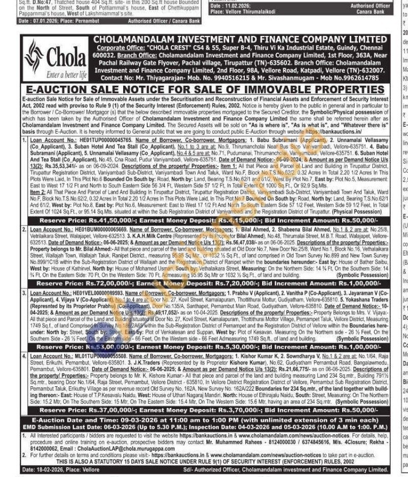 Descriptions of the property/Properties: Property belongs to Mr. Bilal Ahmed:- All that piece and parcel of the land and building situated at Old Door No.7, New Door No 25/8, Ward No. 1, Block No. 16, Vethalaikara Street, Wallajah Town, Wallajah Taluk, Ranipet District, measuring 95.95 Sq.Mtr., or 1032 % Sq. Ft., of land comprised in Old Town Survey No.899 and New Town Survey No.899/1C1B within the Sub-Registration District of Wallajah and the Registration District of Ranipet within the boundaries hereunder:- East by: House of Bather Saibu, West by: House of Kathirvel, North by: House of Mohamed Usman, South by: Vethalaikara Street, Measuring: On the Northem Side: 144 Ft, On the Southem Side: 14 4 Ft. On the Eastem Side: 70 Ft, On the Western Side: 70 Ft. Admeasuring 95.95 Sq.Mir or 1032 ½ Sq Ft., of land and building.