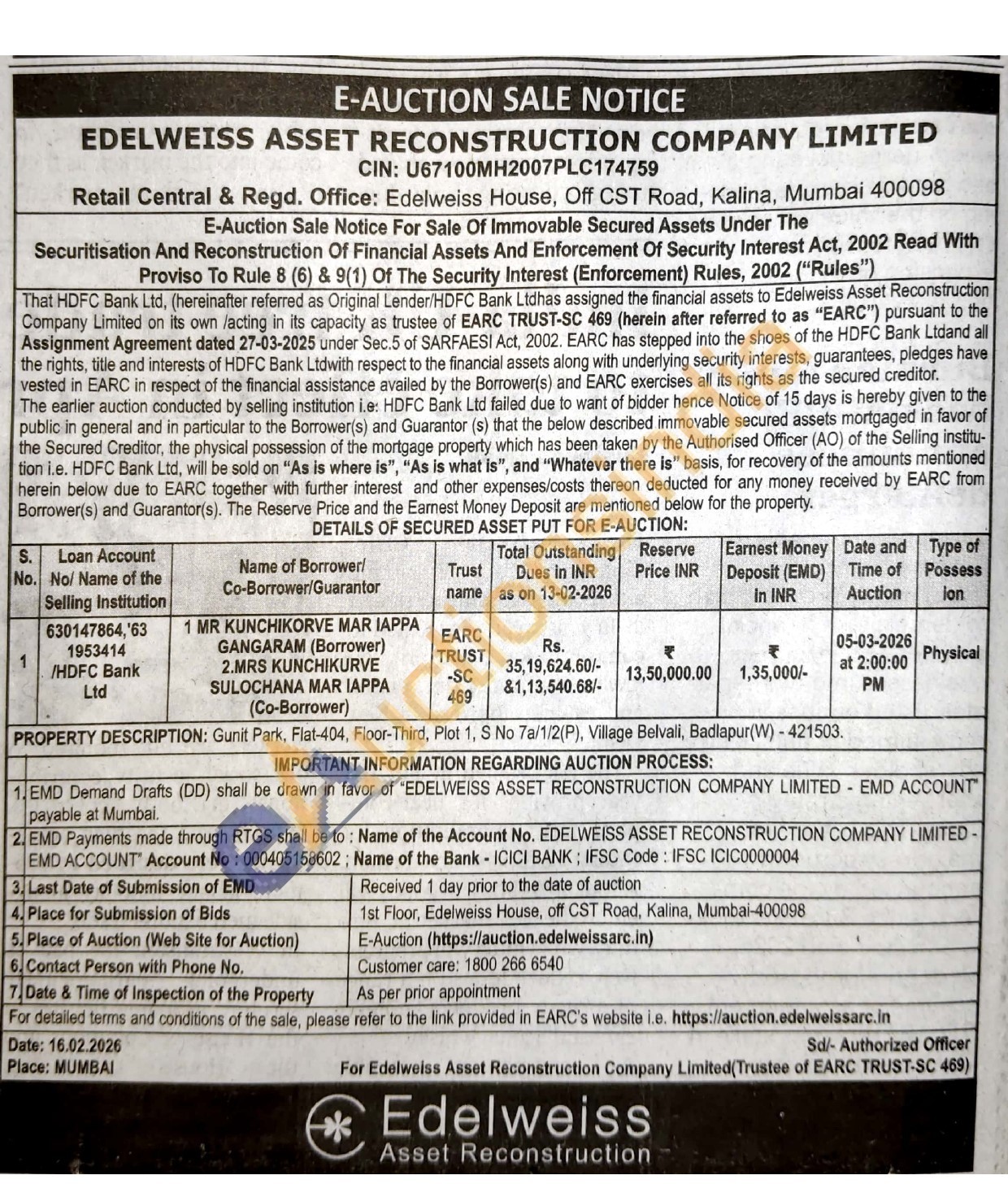 PROPERTY DESCRIPTION: Gunit Park, Flat-404, Floor-Third, Plot 1, S No 7a/1/2(P), Village Belvali, Badlapur(W) -421503