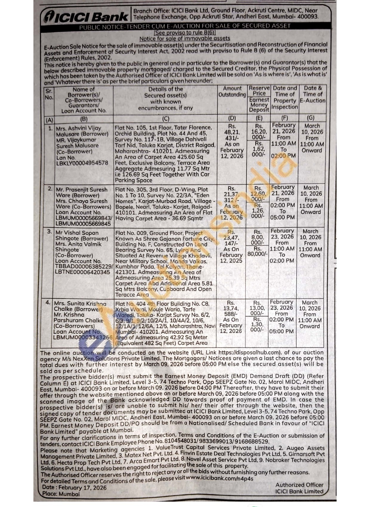 Flat No. 009, Ground Floor, Project Known As Shree Gajanan Fortune City, Building No. F. Constructed On Land Bearing Survey No. 65, Lying And Situated At Revenue Village Khadavli, Near Military School, Manda Valkas. Kumbhar Pada, Tal Kalyan, Thane-421301. Admeasuring An Area of Admeasuring Area 25.39 Sq Mtrs Carpet Area Abd Additional Area 5.81 Sq Mtrs Balcony. Cupboard And Open Teracce Area