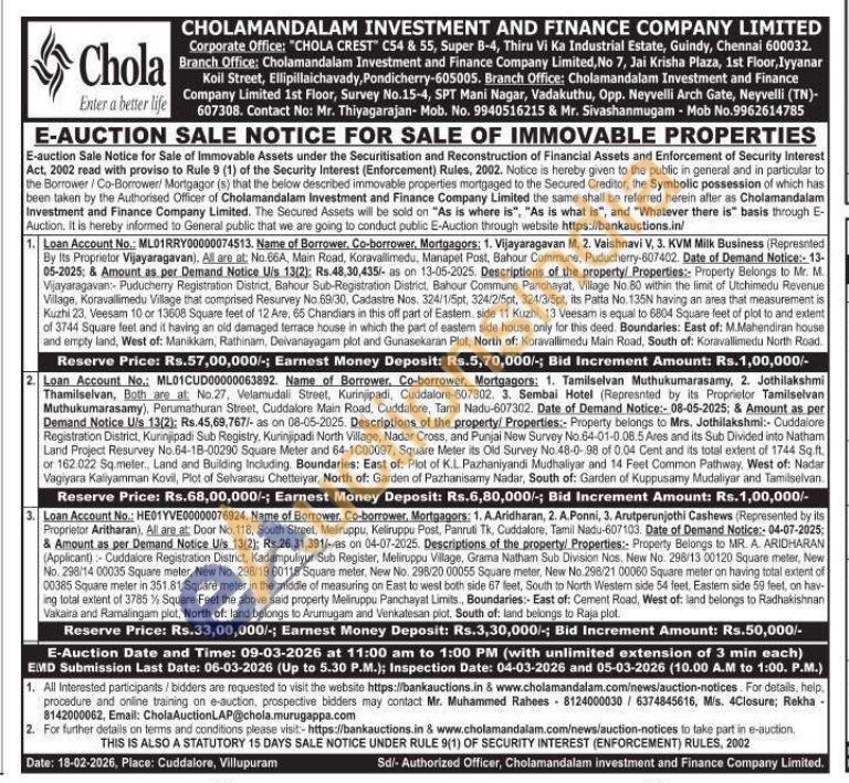 Descriptions of the property/ Properties: Property Belongs to MR. A. ARIDHARAN (Applicant): Cuddalore Registration District, Kadampuliyur Sub Register, Meliruppu Village, Grama Natham Sub Division Nos. New No. 298/13 00120 Square meter, New No. 298/14 00035 Square meter, New No. 298/19 00115 Square meter, New No. 298/20 00055 Square meter, New No. 298/21 00060 Square meter on having total extent of 00385 Square meter in 351.81 Square meter in the middle of measuring on East to west both side 67 feet, South to North Western side 54 feet, Eastern side 59 feet, on hav-ing total extent of 3785% Square Feet the above said property Meliruppu Panchayat Limits., Boundaries:- East of: Cement Road, West of: land belongs to Radhakishnan Vakaira and Ramalingam plot, North of: land belongs to Arumugam and Venkatesan plot, South of land belongs to Raja plot