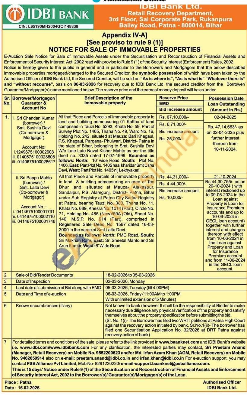 All that Piece and Parcels of immovable property ie land & building admeasuring an area of Ten Dhur land, situated at Mauza- Alakaspur, Sandalpur, P.S. Alamgunj, District- Patna, Bihar under Sub Registry at Patna City Sadar Registry at Patna, bearing Tauzi No. 303, Thana No. 11, Khata No. 689, Khesra No. 1014 (Part), Circle No. 71, Holding No. 485 (New)/69A (Old), Sheet No. 140, M.S.P. No. 614 (Part), comprised in Registered Sale Deed No. 1567 dated 16-03-2000 in the name of Smt Lalta Devi.