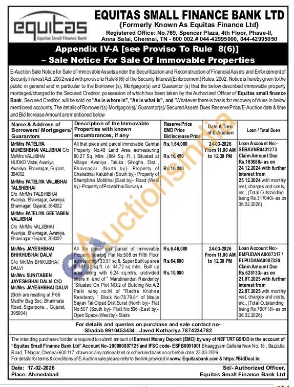 All that piece and parcel immovable Gamtal Property No.48 Land Area admeasuring 80.27 Sq. Mtrs (864 Sq. Ft.) Situated at Village: Avaniya, Taluka Ghogha, Dist., Bhavnagar. (North by) Property of Chakabhai Kalubhai (South by)-Property of Shamjibhai Motibhai (East by)- Road (West by)-Property of Pravinbhai Sarvaiya