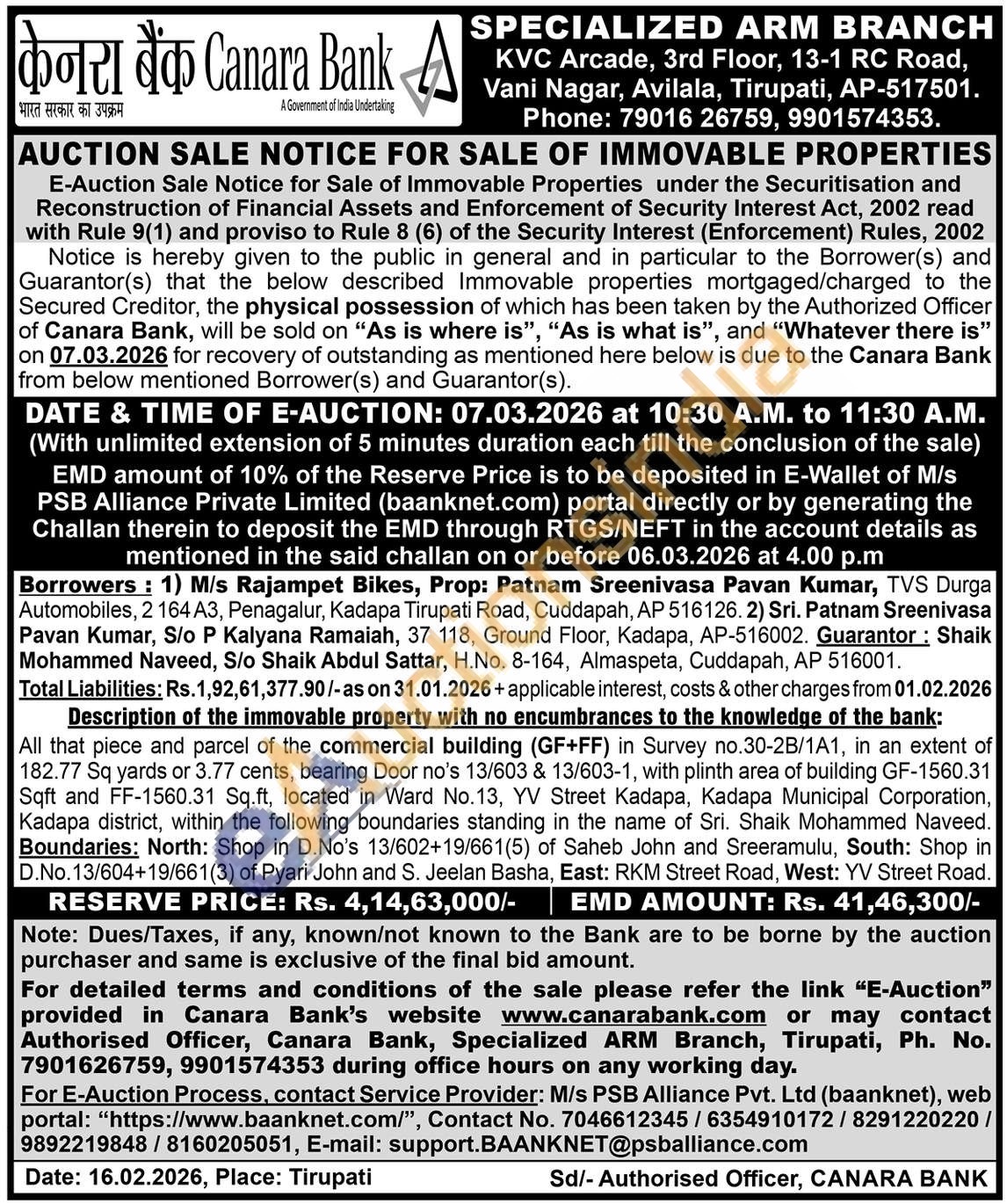 All that piece and parcel of the commercial building (GF+FF) in Survey no.30-2B/1A1, in an extent of 182.77 Sq yards or 3.77 cents, bearing Door no's 13/603 & 13/603-1, with plinth area of building GF-1560.31 Sqft and FF-1560.31 Sq.ft, located in Ward No.13, YV Street Kadapa, Kadapa Municipal Corporation, Kadapa district, within the following boundaries standing in the name of Sri. Shaik Mohammed Naveed. Boundaries: North: Shop in D.No's 13/602+19/661(5) of Saheb John and Sreeramulu, South: Shop in D.No.13/604+19/661(3) of Pyari John and S. Jeelan Basha, East: RKM Street Road, West: YV Street Road