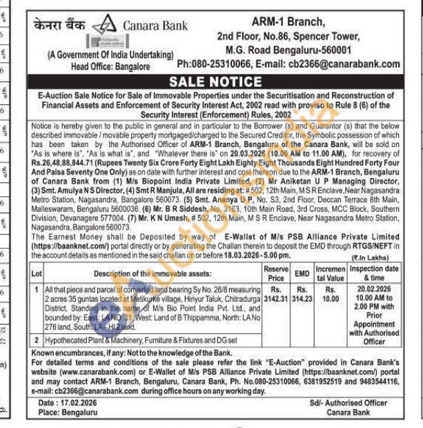 All that piece and parcel of converted land bearing Sy No. 26/8 measuring 2 acres 35 guntas located at Metikurke village, Hiriyur Taluk, Chitradurga District, Standing in the name of M/s Bio Point India Pvt. Ltd., and bounded by: East: LANO. 31, West: Land of B Thippamma, North: LA No 276 land, South: LA-HI 2 land.