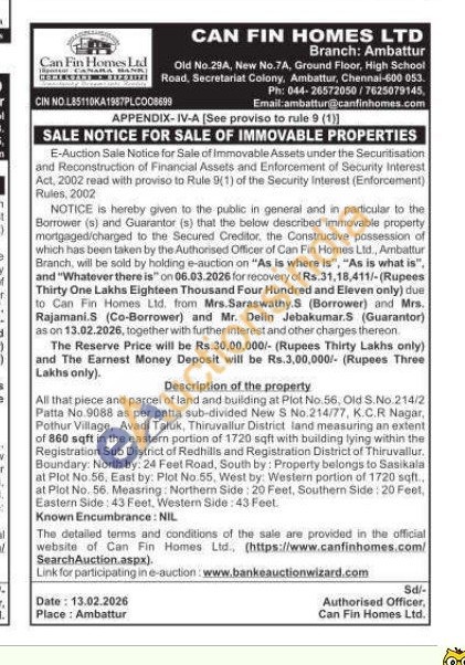 All that piece and parcel of land and building at Plot No.56, Old S.No.214/2 Patta No.9088 as per patta sub-divided New S No.214/77, K.C.R Nagar, Pothur Village, Avadi Taluk, Thiruvallur District land measuring an extent of 860 sqft in the eastern portion of 1720 sqft with building lying within the Registration Sub District of Redhills and Registration District of Thiruvallur. Boundary: North by: 24 Feet Road, South by: Property belongs to Sasikala at Plot No.56, East by: Plot No.55, West by: Western portion of 1720 sqft., at Plot No. 56. Measring: Northern Side: 20 Feet, Southern Side: 20 Feet, Eastern Side: 43 Feet, Westem Side: 43 Feel