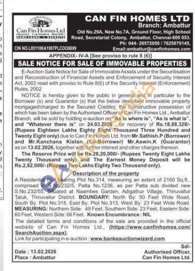 A Residential Plot bearing Plot No.314, measuring an extent of 2160 Sq.ft. comprised in S.No.232/5, Patta No.1236, as per Patta sub divided new S.No.232/55, Situated at Naambes Garden, Adigathur Village, Thiruvallur Taluk, Thiruvallur District. BOUNDARY: North By: 50 Feet Wide Road, South By: Plot No.315. East By: Plot No.313, West By: 23 Feet Wide Road. MEASURING: Northern Side: 49 Feet, Southern Side: 23 Feet, Eastern Side: 60 Feet, Western Side: 66 Feet. Known Encumbrance: NIL