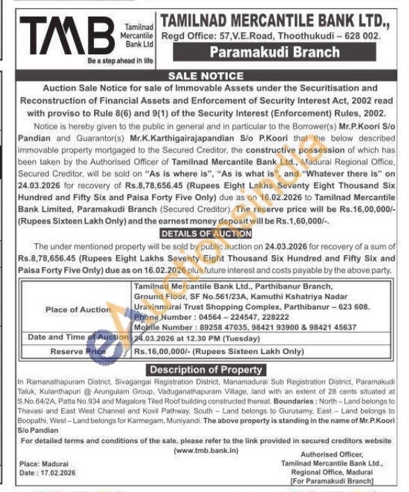 In Ramanathapuram District, Sivagangai Registration District, Manamadurai Sub Registration District, Paramakudi Taluk, Kulanthapuri Arungulam Group, Vaduganathapuram Village, land with an extent of 28 cents situated at S.No.64/2A, Patta No. 934 and Magalore Tiled Roof building constructed thereat. Boundaries: North-Land belongs to Thavasi and East West Channel and Kovil Pathway, South-Land belongs to Gurusamy, East-Land belongs to Boopathi, West-Land belongs for Karmegam, Muniyandi. The above property is standing in the name of Mr.P.Koori Sio Pandian