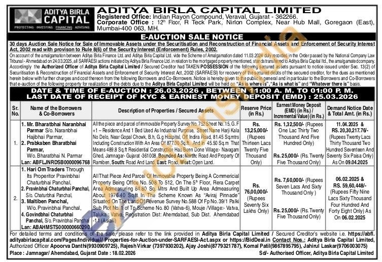 All the piece and parcel of immovable Property Survey No. 752 Sheet No. 15. G.F +1-Residence And 1 Bed Used As Industrial Purpose, Street Name Harji Kala No Delo. Near Gopal Chowk, B.h, G.g Hospital, Off Indira Road, 81.45 Sqmtrs Including Construction With An Area Of 877.00 Sq.ft. And in 45.50 Sq.m That Means 489.8 Sq.ft Residential Construction Has Been Done Village:- Navagam Ghed, Jamnagar-Gujarat 361008. Bounded As: North: Road And Property Of Ramiben, South: Road And Land, East Road, West: Open Land.