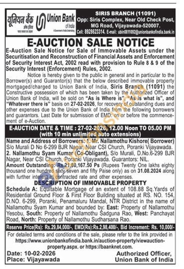 Schedule A: Equitable Mortgage of an extent of 108.88 Sq. Yards of Residential Ground Floor & First Floor Building situated at RS. NO. 154, D.NO. 6-299, Poranki, Penamaluru Mandal, NTR District in the name of Nallamothu Syam Kumar and bounded by: East: Property of Nallamothu Yesobu, South: Property of Naliamothu Sadguna Rao, West: Panchayat Road, North: Property of Nallamothu Sudharsana Rao.