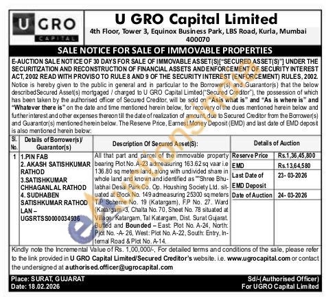 All that part and parcel of the immovable property bearing Plot No.A-23 admeasuring 163.62 sq vaarie 136.80 sq meters land, along with undivided share in whole land and known and identified as "Shree Bhu-labhai Desai Park Co. Op. Houshing Society Ltd. sit-uated at Block No. 149 admeasuring 25300 sq meters T.P Scheme No. 19 (Katargam), F.P No. 27. Ward (Kalargam-3. Chalta No. 70, Sheet No. 78 situated at Village: Katargam, Tal Katargam, Dist. Surat Gujarat. Butled and Bounded-East: Plot No. A-24, North: Plot No. -A-26, West: Plat No. A-22, South: Entry, In-ternal Road & Plot No. A-14