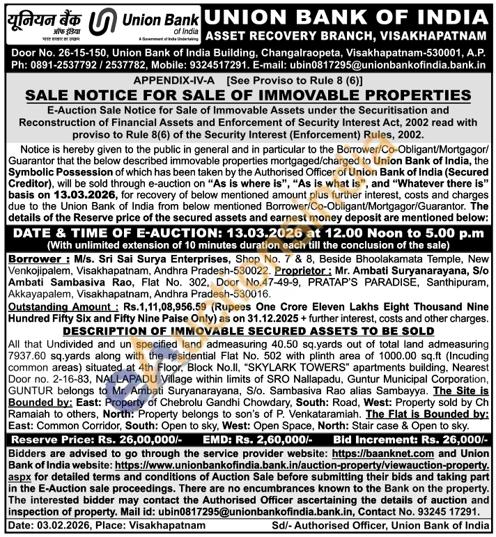 DESCRIPTION OF IMMOVABLE SECURED ASSETS TO BE SOLD : All that Undivided and un specified land admeasuring 40.50 sq.yards out of total land admeasuring 7937.60 sq.yards along with the residential Flat No. 502 with plinth area of 1000.00 sq.ft (Incuding common areas) situated at 4th Floor, Block No.II, "SKYLARK TOWERS" apartments building, Nearest Door no. 2-16-83, NALLAPADU Village within limits of SRO Nallapadu, Guntur Municipal Corporation, GUNTUR belongs to Mr. Ambati Suryanarayana, S/o. Sambasiva Rao alias Sambayya. The Site is Bounded by: East: Property of Chebrolu Gandhi Chowdary, South: Road, West: Property sold by Ch Ramaiah to others, North: Property belongs to son's of P. Venkataramiah. The Flat is Bounded by: East: Common Corridor, South: Open to sky, West: Open Space, North: Stair case & Open to sky