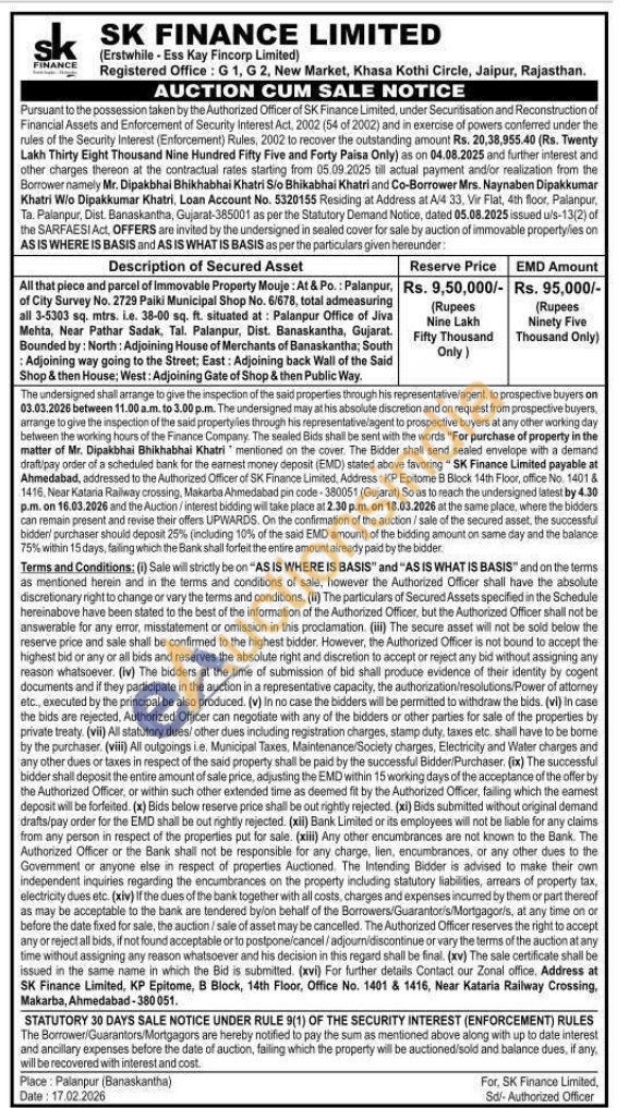 All that piece and parcel of Immovable Property Mouje: At & Po.: Palanpur, of City Survey No. 2729 Paiki Municipal Shop No. 6/678, total admeasuring all 3-5303 sq. mtrs. i.e. 38-00 sq. ft. situated at: Palanpur Office of Jiva Mehta, Near Pathar Sadak, Tal. Palanpur, Dist. Banaskantha, Gujarat. Bounded by: North: Adjoining House of Merchants of Banaskantha; South Adjoining way going to the Street; East: Adjoining back Wall of the Said Shop & then House; West: Adjoining Gate of Shop & then Public Way