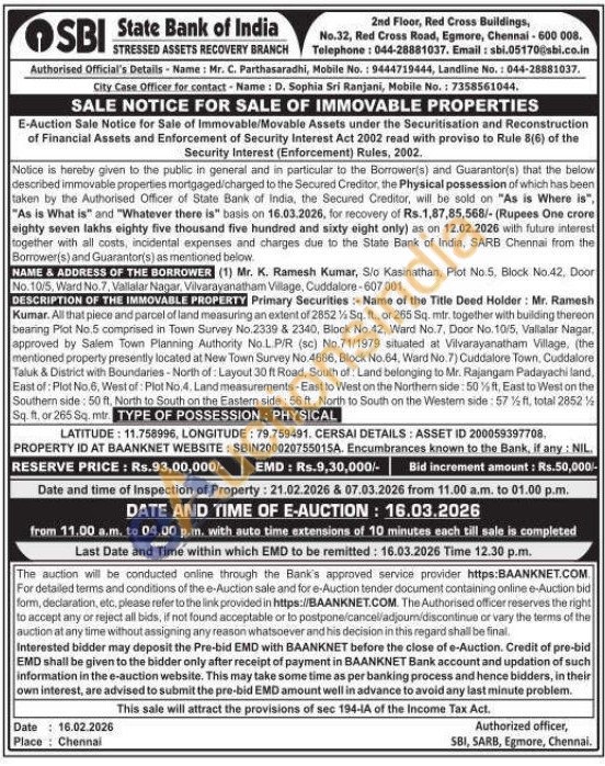 Authorised Officer's Details: Mr. C. Parthasaradhi Mobile No : 9444719444 / Landline No: 044-288810378/ City Case Officer D. Sophia Sri Ranjani, Mobile No: 7358561044