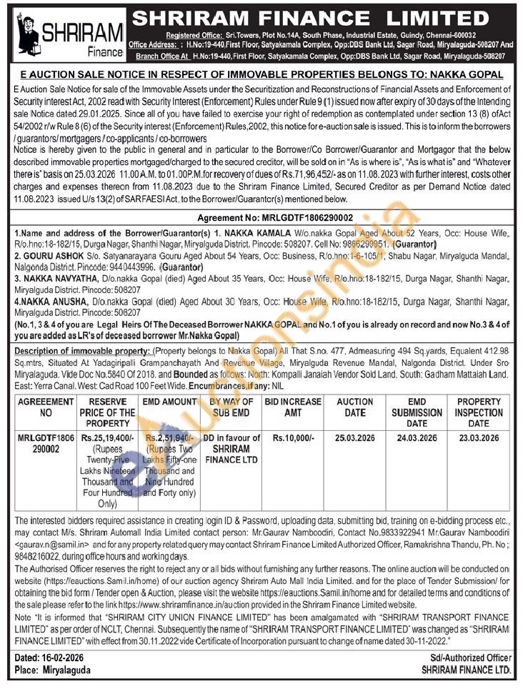 Description of immovable property: (Property belongs to Nakka Gopal) All That S.no. 477, Admeasuring 494 Sq.yards, Equalent 412.98 Sq.mtrs, Situated At Yadagiripalli Grampanchayath And Revenue Village, Miryalguda Revenue Mandal, Nalgonda District. Under Sro Miryalaguda. Vide Doc No.5840 Of 2018. and Bounded as follows: North: Kompalli Janaiah Vendor Sold Land, South: Gadham Mattaiah Land. East: Yerra Canai. West: Cad Road 100 Feet Wide
