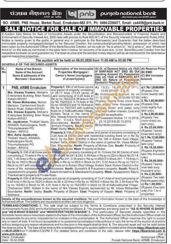 EM of all those pieces and parcel of property consisting of 29.77 Ares (73.53 cents) of Land comprising of 0.25 Ares in Re sy no 162/3/2,9.38 ares in Re Sy No 162/5/2/2, 0.75 Ares in Re Sy no 162/8/2/2 and 19.39 Ares in Re Sy no 162/23/2 with building there on in Kalluvathukkal Village, Kollam Taluk in the name of M/s. Viswas Exports represented by Mr. Viswa Mohandas Boundaries: North: Ambika Amma's Property South: Vazhy. East: Vazhy West: Road