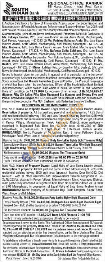 Description of property: All that part and parcel of land admeasuring 17.75 Cents with residential building having 1200 sq.ft area (approx.) bearing Door No.1/345 with all other usufructs and improvements thereon comprised in Re-Sy.No.263/pt, situated in Pavoor Village, Manjeshwaram Taluk, Kasaragod District, more particularly described in Registered Sale Deed No. 12/2009 dated 01.01.2009 of SRO Manjeshwar, in possession of Legal Heirs of Late.Bawa Ibrahim Ansari.