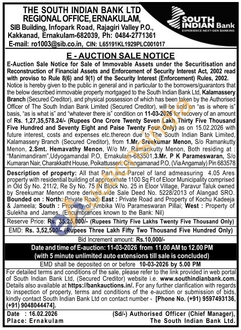 property with residential building of approximate 1100 Sq Ft of Eloor Municipality comprised in Old Sy No. 211/2, Re Sy No. 75 IN Block No. 25 in Eloor Village, Paravur Taluk owned by Sreekumar Menon more derived vide Sale Deed No. 5228/2013 of Alangad SRO. Bounded on: North: Private Road; East: Private Road and Property of Kochu Kadeeja & Jameela; South Property of Ambika W/o Parameswaran Pillai; West: Property of Sulekha and James