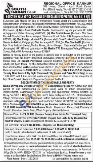 DESCRIPTION OF THE IMMOVABLE PROPERTY : Name of Property Owner: Mr Harilal TV, Description of property: All that part and parcel of land admeasuring 22 Cents along with all other constructions, improvements, easementary rights existing and appurtenant thereon situated in Re.Sy.No. 135/PT (135/7 as per Title Deed), New Re.Sy.No. 135/PT26 of Karinthalam Village, Vellanikundu Taluk, Kasaragod District and owned by Mr Harilal TV,more fully described in Registered Jenmam Deed No.2504/17 dated 20.10.2017 of Sub Registrar Office Neeleswaram. BOUNDARIES as per location certificate no.36504520 dated 13.11.2018 issued by V.0 Karinthalam: North: Property of Pathu, East: Property of Sreejith, Chandran, South: Road, West: Property of Abdul Rahman