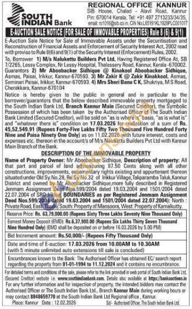 Name of Property Owner: Mr Aboobacker Sidhique, Description of property: All that part and parcel of land admeasuring 87.50 Cents along with all other constructions, improvements, easementary rights existing and appurtenant thereon situated under Old Sy.No.28, Re.Sy.No.32 of Irikkur Village, Taliparamba Taluk, Kannur District and owned by Mr Aboobacker Sidhique, more fully described in Registered Jenmam Assignment Deed Nos.599/2004 dated 19.03.2004 and 1501/2004 dated 22.07.2004 of SRO Irikkur. BOUNDARIES as per Registered Jenmam Assignment Deed Nos 599/2004 dated 19.03.2004 and 1501/2004 dated 22.07.2004): North: Private Road, East: Thodu, South: Property of Mansoora, West: Property of Kamalkutty