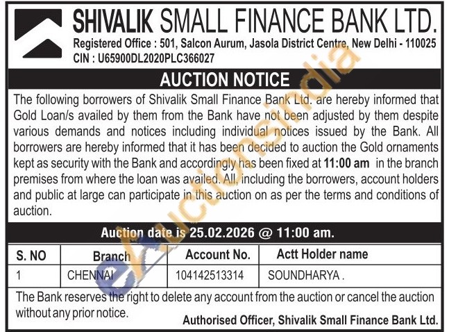 Shivalik Small Finance Bank Ltd Gold Auctions Auction in Chennai