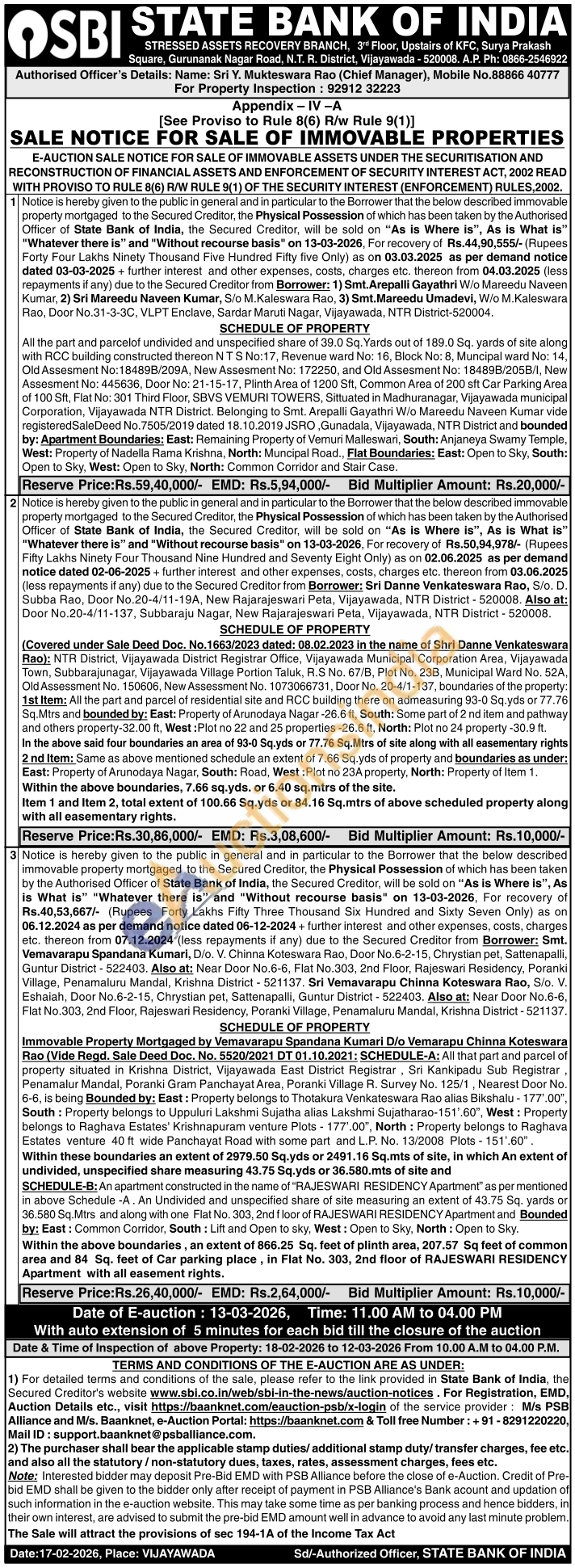 Authorised Officer's Details: Name: Sri Y. Mukteswara Rao (Chief Manager) Mobile No : 88866 40777