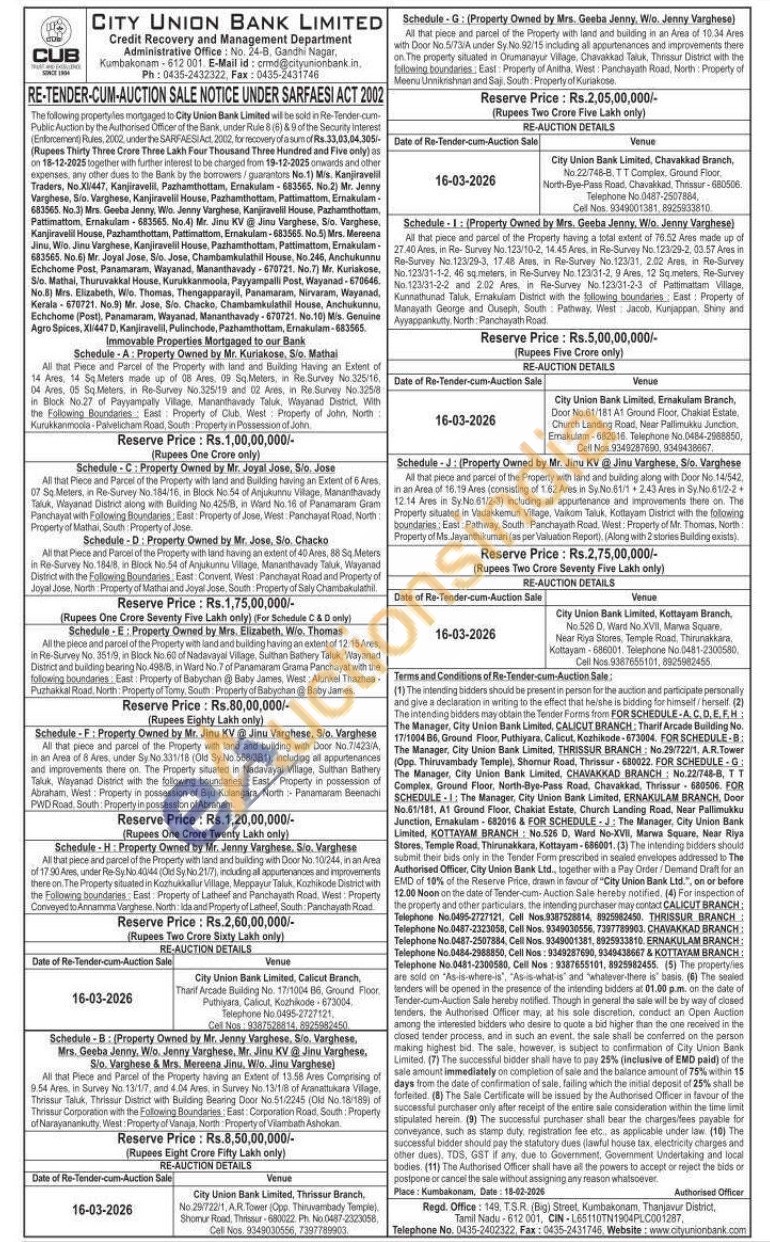 1)All that Piece and Parcel of the Property with land and Building Having an Extent of 14 Ares, 14 Sq Meters made up of 08 Ares, 09 Sq.Meters, in Re Survey No 325/16, 04 Ares, 05 Sq.Meters, in Re-Survey No.325/19 and 02 Ares, in Re Survey No.325/8 in Block No.27 of Payyampally Village, Mananthavady Taluk, Wayanad District, With the Following Boundaries East Property of Club, West Property of John, North: Kurukkanmoola-Palvelicham Road, South Property in Possession of John