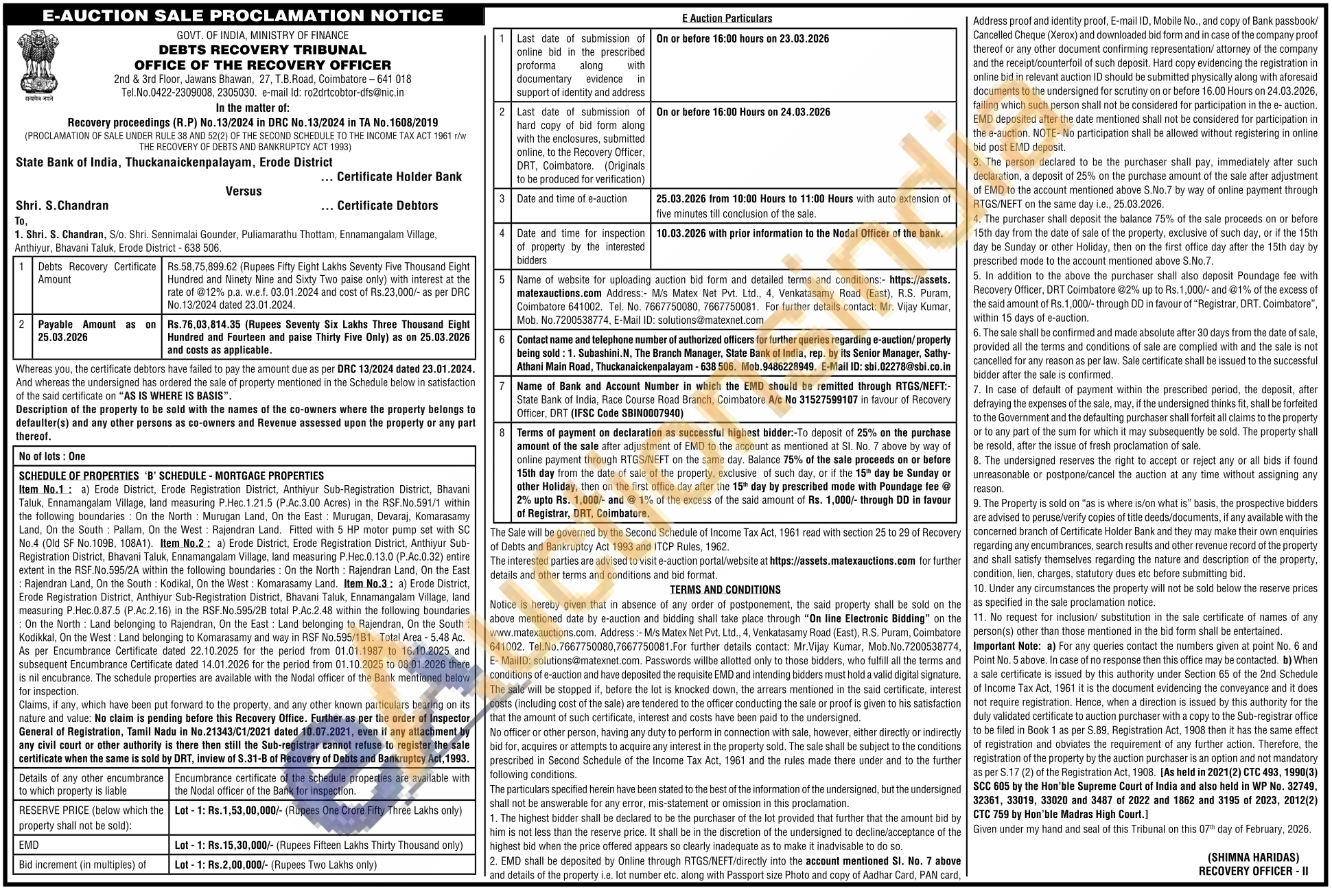 Item No.1: a) Erode District, Erode Registration District, Anthiyur Sub-Registration District, Bhavani Taluk, Ennamangalam Village, land measuring P.Hec. 1.21.5 (P.Ac.3.00 Acres) in the RSF.No.591/1 within the following boundaries: On the North: Murugan Land, On the East: Murugan, Devaraj, Komarasamy Land, On the South Pallam, On the West: Rajendran Land. Fitted with 5 HP motor pump set with SC No.4 (Old SF No.109B, 108A1). Item No.2: a) Erode District, Erode Registration District, Anthiyur Sub-Registration District, Bhavani Taluk, Ennamangalam Village, land measuring P.Hec.0.13.0 (P.Ac.0.32) entire extent in the RSF.No.595/2A within the following boundaries: On the North: Rajendran Land, On the East : Rajendran Land, On the South: Kodikal, On the West: Komarasamy Land. Item No.3: a) Erode District, Erode Registration District, Anthiyur Sub-Registration District, Bhavani Taluk, Ennamangalam Village, land measuring P.Hec.0.87.5 (P.Ac.2.16) in the RSF.No.595/2B total P.Ac.2.48 within the following boundaries : On the North: Land belonging to Rajendran, On the East: Land belonging to Rajendran, On the South: Kodikkal, On the West: Land belonging to Komarasamy and way in RSF No.595/1B1. Total Area-5.48 Ас. As per Encumbrance Certificate dated 22.10.2025 for the period from 01.01.1987 to 16.10.2025 and subsequent Encumbrance Certificate dated 14.01.2026 for the period from 01.10.2025 to 08.01.2026 there is nil encubrance. The schedule properties are available with the Nodal officer of the Bank mentioned below for inspection