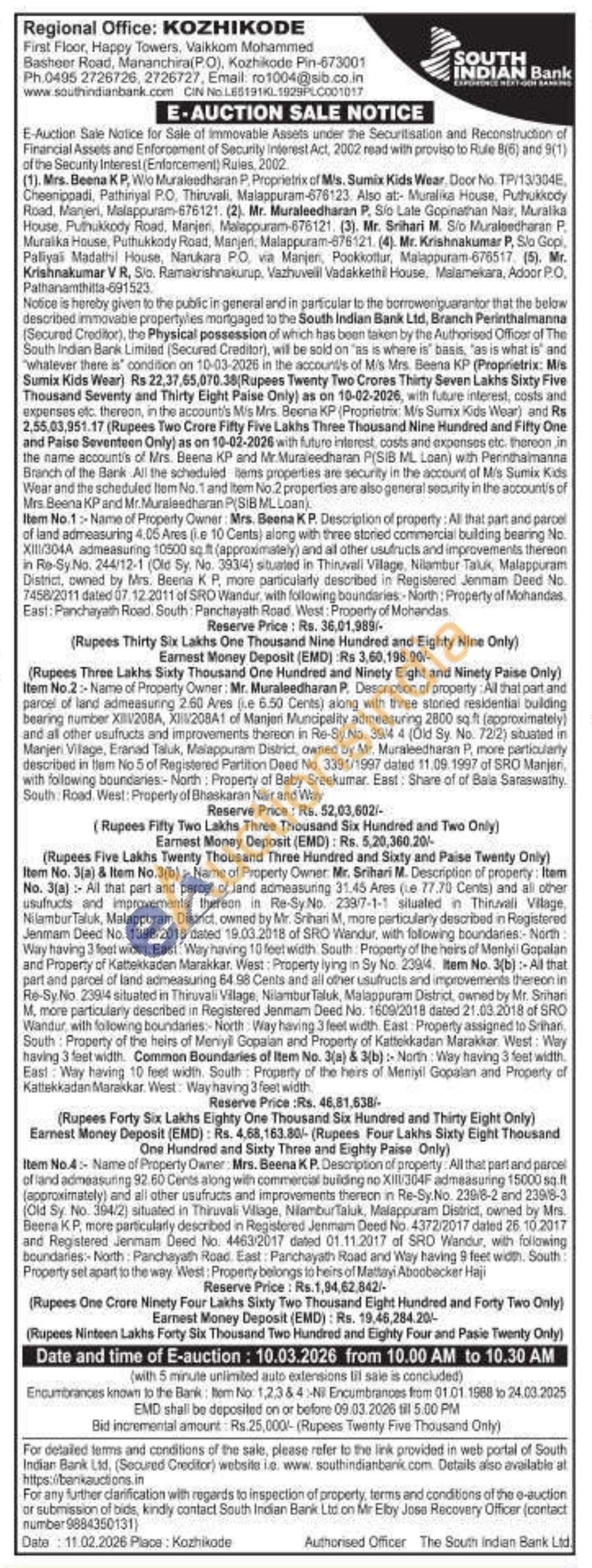 Item No.2: Name of Property Owner: Mr. Muraleedharan P. Description of property: All that part and parcel of land admeasuring 2.60 Ares (ie 6.50 Cents) along with three stoned residential building bearing number XIV208A, XIII/208A1 of Manjern Muncipality admeasuring 2800 sq ft (approximately) and all other usufructs and improvements thereon in Re-Sy.No. 394 4 (Old Sy. No. 72/2) situated in Manjeri Village, Eranad Taluk, Malappuram District, owned by Mr. Muraleedharan P, more particularly described in tem No 5 of Registered Partition Deed No. 3391/1997 dated 11.09.1997 of SRO Manjari, with following boundaries:- North: Property of Baby Sreekumar. East: Share of of Bala Saraswathy. South Road West: Property of Bhaskaran Nair and Way