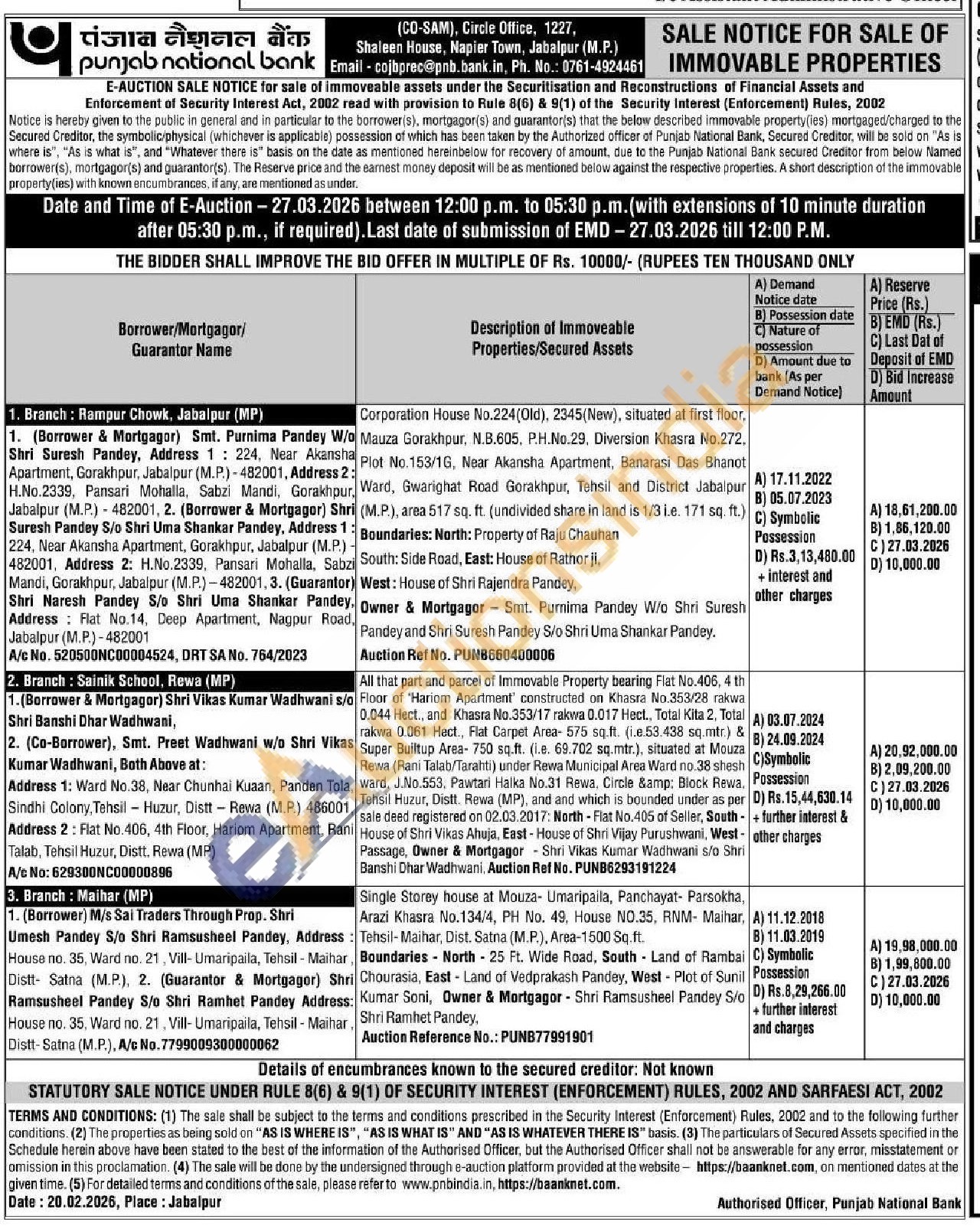 Single Storey house at Mouza- Umaripaila, Panchayat- Parsokha, Arazi Khasra No.134/4, PH No. 49, House NO.35, RNM- Maihar, Tehsil-Maihar, Dist. Satna (M.P.), Area-1500 Sq.ft. Boundaries - North-25 Ft. Wide Road, South Land of Rambai Chourasia, East - Land of Vedprakash Pandey, West - Plot of Sunil Kumar Soni, Owner & Mortgagor - Shri Ramsusheel Pandey S/o Shri Ramhet Pandey, Auction Reference No.: PUNB77991901