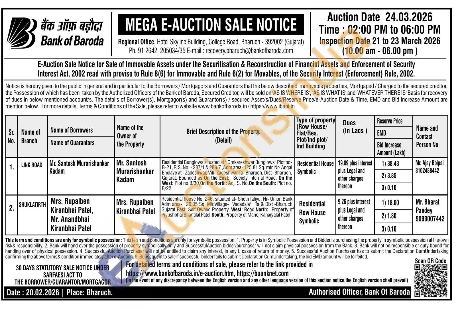 Residential house No. 246, situated at- Sheth faliyu, Nr- Union Bank, Adm area-126.05 Sq. Mtr. Village Vadadala Ta & Dist-Bharuch, Gujarat, East: Self Owned Property, West: Road, North: Property of Piyushbhai Shantilal Patel, South: Property of Manoj Kanaiyalal Patel