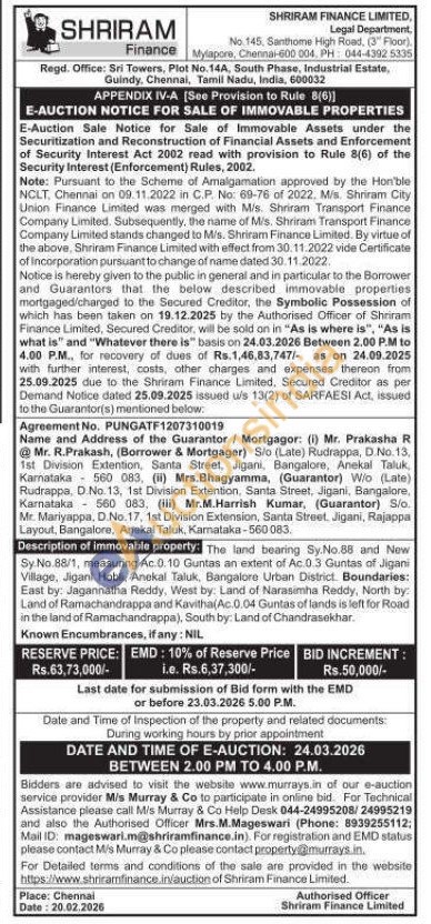 Contact Authorised Officer Mrs.M.Mageswari (Phone: 8939255112; Mail ID: mageswari.m@shriramfinance.in).