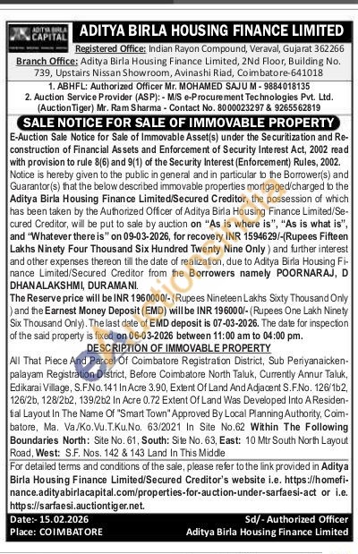 All That Piece And Parcel Of Coimbatore Registration District, Sub Periyanaicken-palayam Registration District, Before Coimbatore North Taluk, Currently Annur Taluk, Edikarai Village, S.F.No. 141 In Acre 3.90, Extent Of Land And Adjacent S.F.No. 126/1b2, 126/2b, 128/262, 139/2b2 In Acre 0.72 Extent Of Land Was Developed Into A Residen-tial Layout In The Name Of "Smart Town" Approved By Local Planning Authority, Coim-batore, Ma. Va/Ko.Vu.T.Ku.No. 63/2021 In Site No.62 Within The Following Boundaries North: Site No. 61, South: Site No. 63, East: 10 Mtr South North Layout Road, West: S.F. Nos. 142 & 143 Land In This Middle