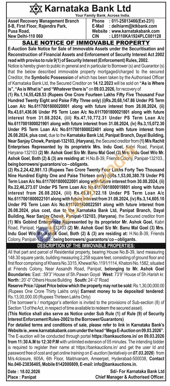 All that part and parcel of Residential property, bearing House No.B-39, land measuring 148.30 square yards, building measuring 2,258 square feet, consisting of ground floor and first floor comprising of Khasra No.3315, Khewat No. 1191/1114, Khatoni No. 1582, situated at Friends Colony, Near Assandh Road, Panipat, belonging to Mr. Ashok Goel Boundaries: East: 59'3" House of Sh. Pawan Goyal West: 73'9" House of Sh. Harish kr. North: 20'-0" Others House Building South: 24-0" Road