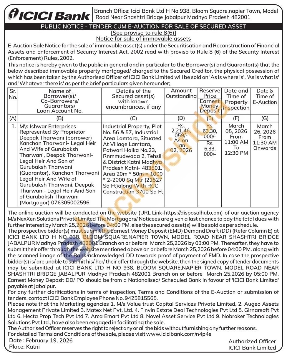 Industrial Property, Plot No. 56 & 57, Industrial Area Lamtara, Situated At Village Lamtara, Patwari Halka No.23, Rnmmudwada 2, Tehsil & District Katni Madhya Pradesh Katni- 483501. Area 20m*50m = 1000 *2-2000 Sq Mtr (21527 Sq Ft)along With RCC Construction 3700 Sq Ft