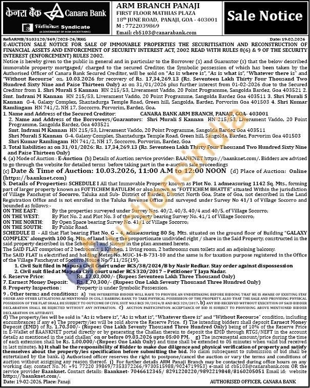 All that Immovable Property known as Plot No. 1 admeasuring 1142 Sq. Mts., forming part of larger property known as FOTTICHEM BATULEM or also known as "FOTTICHEM BHATTE" situated Within the jurisdiction. of Village Panchayat of Socorro, Taluka and Sub-District of Bardez, District North Goa, State of Goa, not described in the Land Registration Office and is not enrolled in the Taluka Revenue Office and surveyed under Survey No 41/1 of Village Socorro and bounded as follows:-ON THE EAST: the properties surveyed under Survey Nos. 40/2, 40/3, 40/4 and 40/5, of Village Socorro, ON THE WEST: By By Plot No. 2 and Plot No. 3 of the property bearing Survey No. 41/1 of Village Socorro; ON THE NORTH: By Open Space bearing Survey No. 41/1 of Village Socorro; ON THE SOUTH: By Public Road. SCHEDULE II All that Flat bearing Flat No. G-4, admeasuring 80 Sq. Mts. situated on the ground floor of Building "GALAXY COMPLEX™ alongwith 100 Sq. Mts. of land being the proportionate undivided right/ share in the Said Property, constructed in the said property described in the Schedule I and shown in the plan annexed hereto. The SAID FLAT comprises of 2 bedrooms, 1 Kitchen, 1 living room, 2 bathrooms cum toilets and an adjoining balcony. The SAID FLAT is electrified and holding Meter No. MUC-14-B-731-10 and the same is for taxation purpose registered in the Office of the Village Panchayat of Socorro House No. 711/25(19).