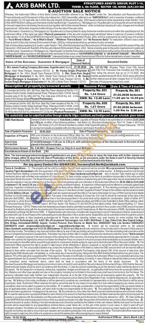 Commercial Unit No. 802. 8th Floor, Best Sky Tower situated at Plot No. F-5, Wazipur District Centre, Netaji Subhash Place, Pitampura Delhi-110034, in the name of Shri Sanjay Singla Sio Shri Sewa Ram together having covered area 39.49 Sq mtrs (425 Sq Fts), total area of 57.23 Sq mtr (Physical Possession