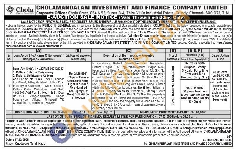 In Cuddalore District, Virudhdhachalam Registration District, Tittagudi Sub-Registration District, Tittagudi Taluk, Perangiyam Village, Ayan Punja, Ayan Punja, Old S.F. No. 92/5, Out of an Acre 1.22 Cents (Hec0-49.5 Ares), an extent of East to West 50 feet on both sides, South to North 30 Feet on both sides, admeasuring 1500 Sq.Ft, bearing Plot No.15, as a Vacant Site along with RCC building Situated within the following four boundaries. North by: Sellammal & Ramu's Property South by: Plot No.16, East by: South to North Pathway West by: Plot No. 28 Now the property is comprised in Patta No.1065 and the sub divided as UDRS.F No.92/5A1B and now the property sub divided as new S.F No.92/21 (Hec 0-1.40 Ares) with mamool