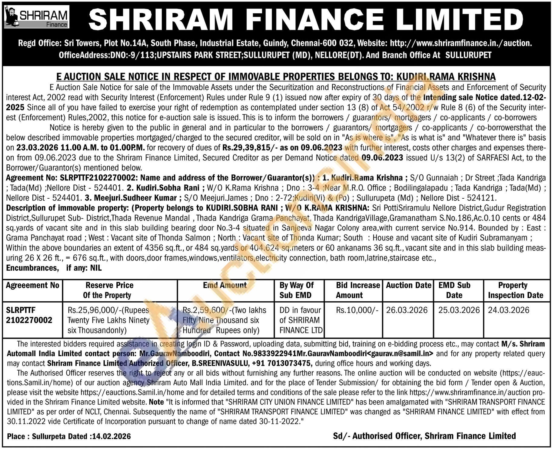 Sri PottiSriramulu Nellore District, Gudur Registration District, Sullurupet Sub-District, Thada Revenue Mandal, Thada Kandriga Grama Panchayat, Thada Kandriga Village, Gramanatham S.No. 186,Ac.0.10 cents or 484 sq.yards of vacant site and in this slab building bearing door No.3-4 situated in Sanjeeva Nagar Colony area, with current service No.914. Bounded by: East: Grama Panchayat road; West: Vacant site of Thonda Salmon North: Vacant site of Thonda Kumar; South House and vacant site of Kudiri Subramanyam; Within the above boundaries an extent of 4356 sq.ft., or 484 sq.yards or 404.624 sq.meters or 60 ankanams 36 sq.ft., vacant site and in this slab building meas-uring 26 X 26 ft., 676 sq.ft., with doors, door frames, windows, ventilators, electricity connection, bath room, latrine, staircase etc.