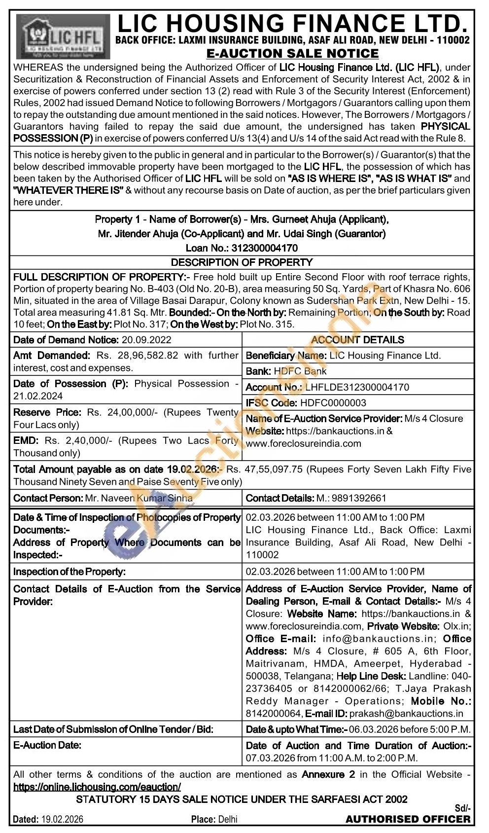 Free hold built up Entire Second Floor with roof terrace rights, Portion of property bearing No. B-403 (Old No. 20-B), area measuring 50 Sq. Yards, Part of Khasra No. 606 Min, situated in the area of Village Basai Darapur, Colony known as Sudershan Park Extn, New Delhi - 15. Total area measuring 41.81 Sq. Mtr. Bounded:- On the North by: Remaining Portion; On the South by: Road 10 feet; On the East by: Plot No. 317; On the West by: Plot No. 315.