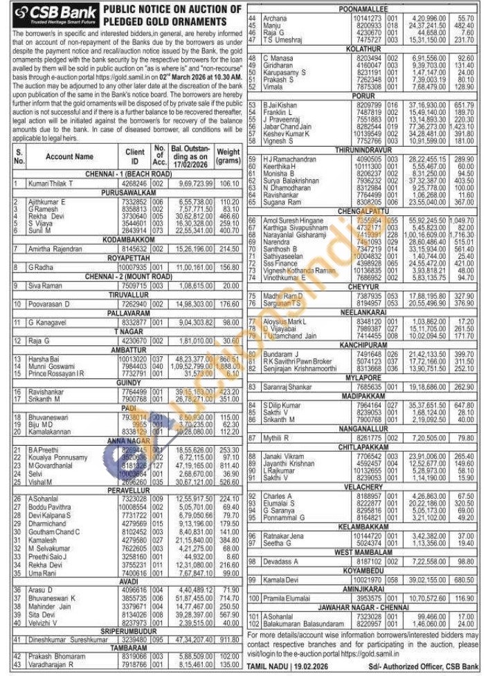 CSB Bank Gold Auctions Auction in Chennai