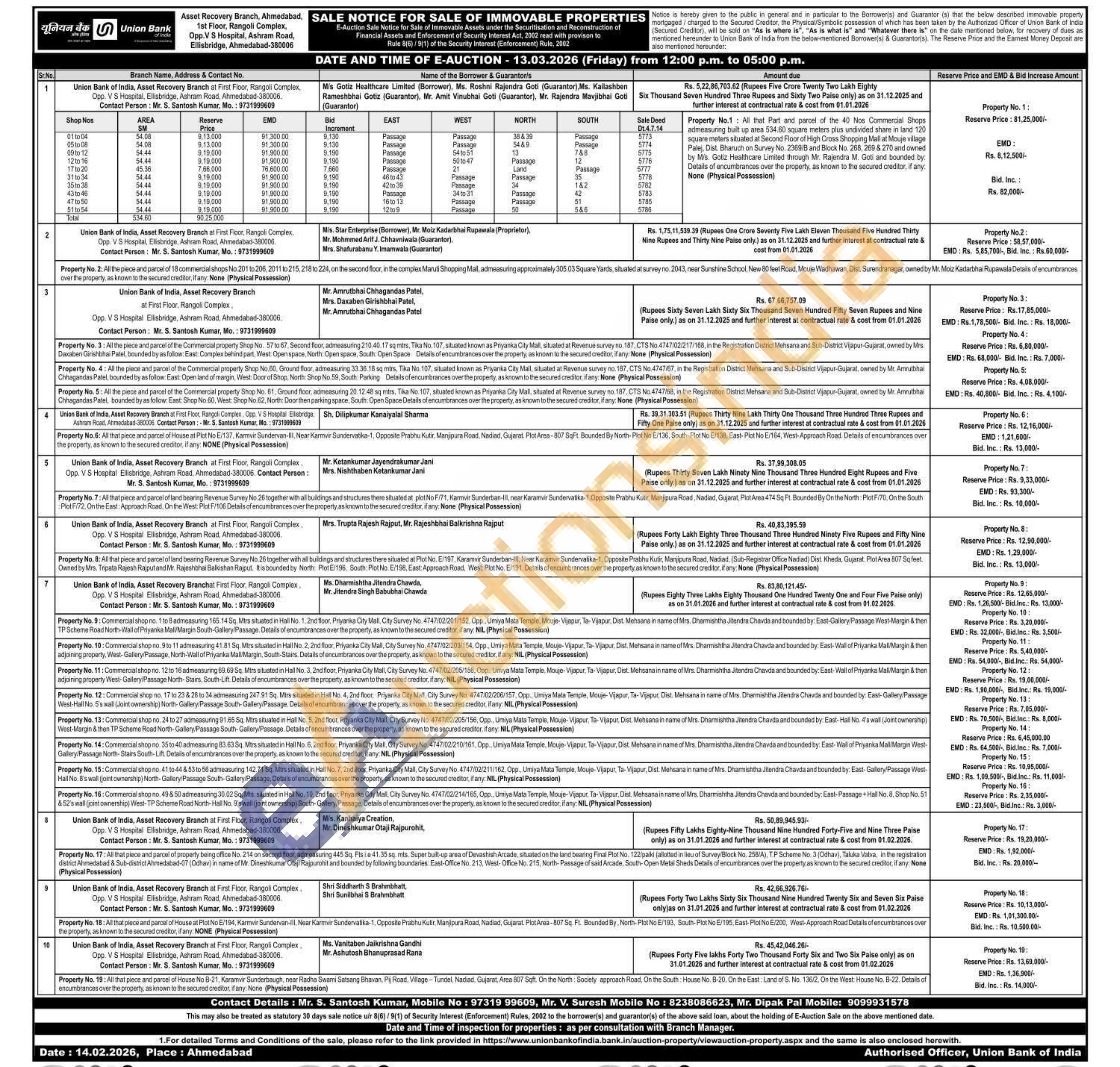 Property No. 2: All the piece and parcel of 18 commercial shops No.201 to 206, 2011 to 215, 218 to 224, on the second floor, in the complex Maruti Shopping Mall, admeasuring approximately 305.03 Square Yards, situated at survey no. 2043, near Sunshine School, New 80 feet Road, Mouje Wadhawan, Dist. Surendranagar, owned by Mr. Moiz Kadarbhai Rupawala Details of encumbrances over the property, as known to the secured creditor, if any: None (Physical Possession