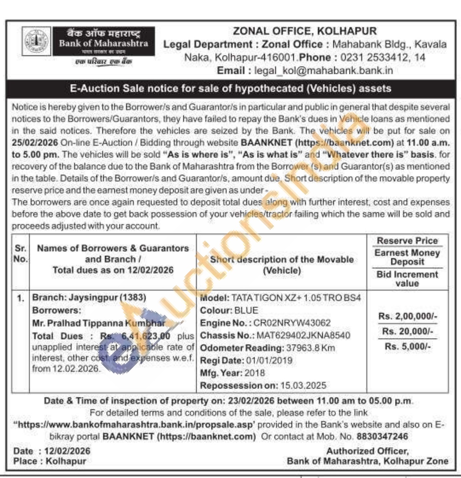 Model: TATA TIGON XZ+ 1.05 TRO BS4 Colour: BLUE Engine No.: CR02NRYW43062 Chassis No.: MAT629402JKNA8540 Odometer Reading: 37963.8 Km Regi Date: 01/01/2019 Mfg. Year: 2018 Repossession on: 15.03.2025