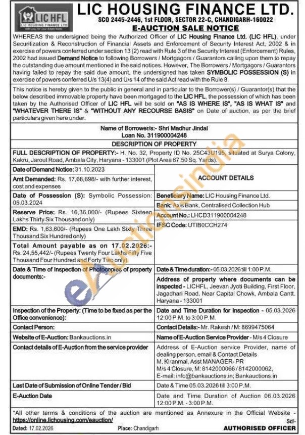 H. No. 32, Property ID No. 25C43U195, situated at Surya Colony, Kakru, Jarout Road, Ambala City, Haryana-133001 (Plot Area 67.50 Sq. Yards).