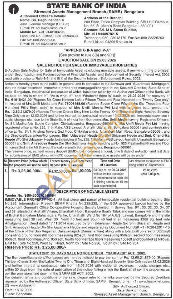 IMMOVABLE PROPERTY NO-1: All that piece and parcel of immovable residential building bearing Site No.235, Intermediate, Present BBMP Khatha No.235/235, in the BDA approved Layout formed by the Accountant General's Office Co-operative Housing Society Limited, in Survey Nos. 6/1, 30, 32, 33, 34, 37 and 38, situated at Arehalli Village, Uttarahalli Hobli, Bangalore South Taluk and now comes within the limits of Bruhat Bangalore Mahanagara Palike, Uttarahalli Ward No 184 of A.G.S. Layout, Bangalore and the site measuring East 30 feet, West 30 North 40 feet and South 40 feet in all measuring 1200 Sq. feet vide Amalgamation Deed dated 17.11.2014 executed by Shri Udayaravi Hegde S/o Shri Shivaram Hegde and Smt. Anasooya Hegde Dio Shri Gajanana Hegde and registered as Document No. BSK-1-10284.2014-15 at the Office of the Sub Registrar, Basavanagudi (Banashankari) along with a total built up area of 3825sqft consisting ground floor(stilt floor) measuring 825sqft, first floor measuring 950sqft, second floor measuring 950sqft, third floor measuring 950 sqft, fourth floor (terrace floor) measuring 150sqft and bounded as follows. East by: Site No.250, West by: Road, North by: Site No.236, South by: Site No.234