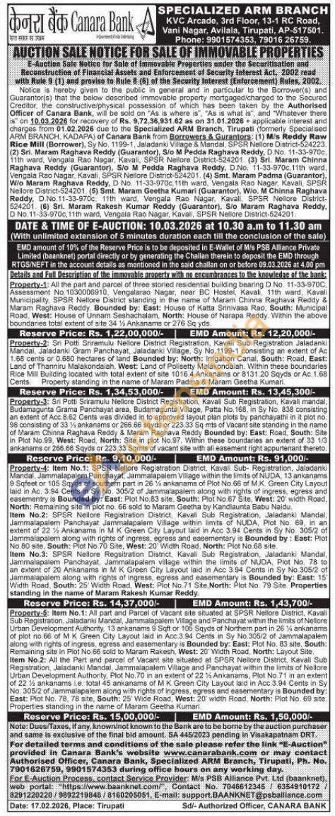 Property-1: All the part and parcel of three storied residential building bearing D No. 11-33-9700, Assessment No. 1030006910, Vengalarao Nagar, near BC Hostel, Kavali, 11th ward, Kavali Municipality, SPSR Nellore District standing in the name of Maram Chinna Raghava Reddy & Maram Raghava Reddy, Bounded by: East: House of Katta Srinivasa Rao, South: Municipal Road, West: House of Unnam Seshachalam, North: House of Narapa Reddy. Within the above boundaries total extent of site 34% Ankanams or 276 Sq yds.