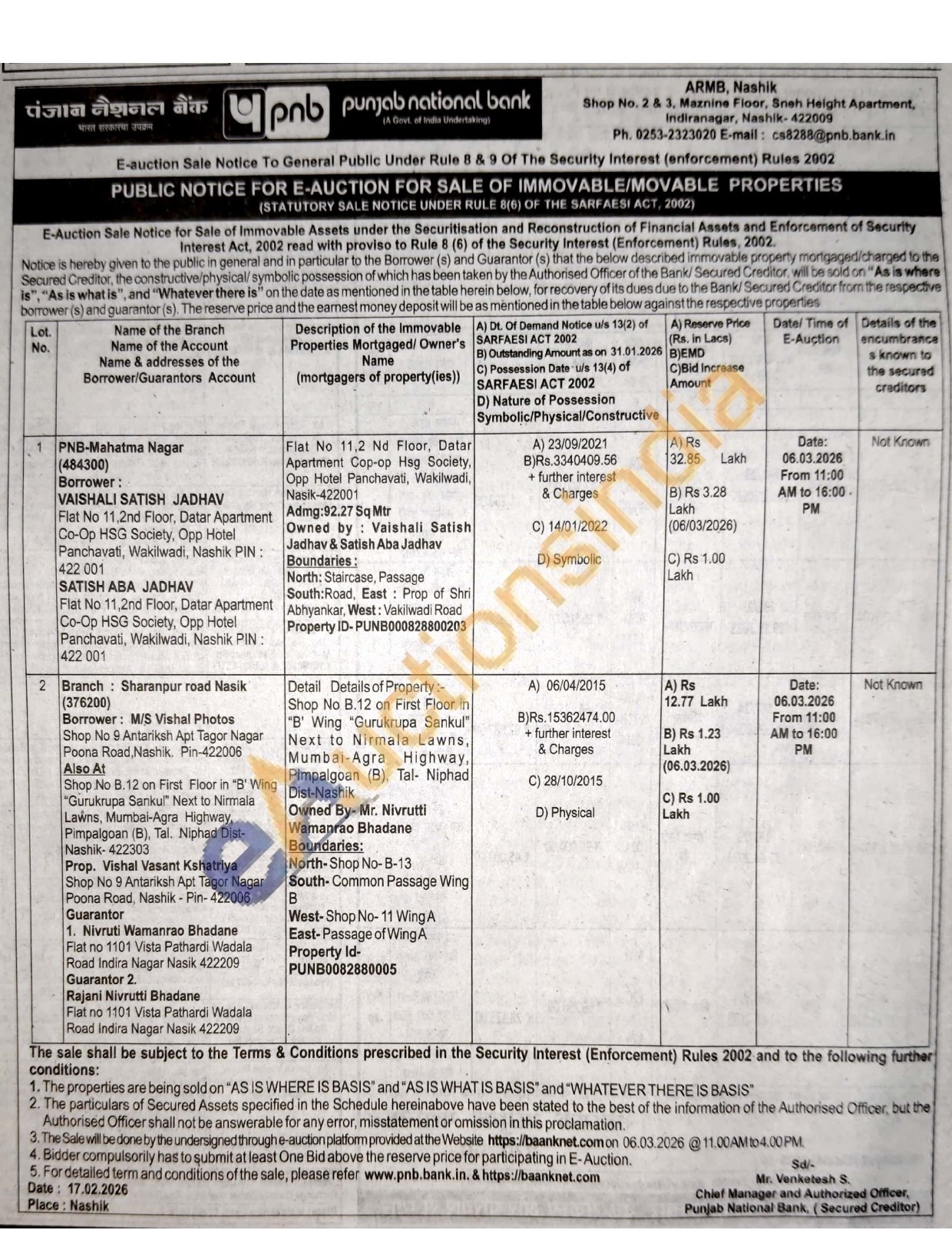 Flat No 11,2 Nd Floor, Datar Apartment Cop-op Hag Society, Opp Hotel Panchavati, Wakilwadi, Nasik-422001 Admg:92.27 Sq Mtr Owned by Vaishali Satish Jadhav & Satish Aba Jadhav Boundaries: North: Staircase, Passage South:Road, East Prop of Shri Abhyankar, West: Vakilwadi Road Property ID-PUNB000828800203
