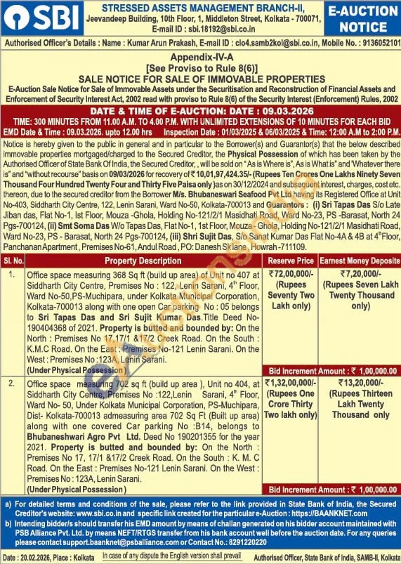 Office space measuring 702 sq ft (build up area), Unit no 404, at Siddharth City Centre, Premises No: 122, Lenin Sarani, 4 Floor, Ward No-50, Under Kolkata Municipal Corporation, PS-Muchipara, Dist- Kolkata-700013 admeasuring area 702 Sq Ft (Built up area) along with one covered Car parking No :B14, belongs to Bhubaneshwari Agro Pvt Ltd. Deed No 190201355 for the year 2021. Property is butted and bounded by: On the North: Premises No 17, 17/1 &17/2 Creek Road. On the South: K. М. С Road. On the East: Premises No-121 Lenin Sarani. On the West: Premises No: 123A, Lenin Sarani.