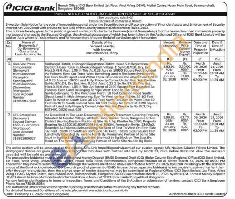 2)As Described in The Loan Document/Property Document Covering Property Situated At Neralur Village, Attibele Hobli, Anekal Taluk, Bangalore Urban District Bearing Eastern Portion of Site No.4, Vp Khatho No.2080, Property Bearing No. 15200101500620664 And 2080/4, Formed in Sy.No. 234/202. Bounded As Follows (Admeasuring An Area of East To West On Both Side 32 Feet, North To South on Both Side: 40 Feet, Totally 1280 Square Feet Land Fully Bounded By: on The North By: Remaining Portion of Same Site No.4 in Bg Block on The South By: Site No.3 in Big Black on The East By: Road on The West By: Remaining Portion of Same Site No.4 in Bg Block
