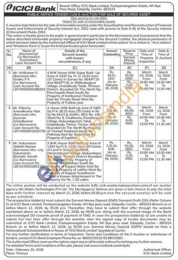 1) 4 BHK House With Super Built-Up Area of 2420 Sq. Ft. In 15.02 Ares (37 Cents) In Survey No. 664/PT19 And 664/PT18, In Vellikulangara Village, Chalakkudy Taluk. Thrissur District. Bounded On The: North By: Panchayath Rood South By: Property of Karikunnel Thomman East By: Private Road West By: Property of Pulikan Jose